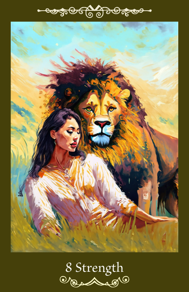 タロットカードの「力(Strength)」は、大アルカナの8番目のカード(デッキによっては11番目のカード)で、内なる力、勇気、忍耐、自己制御、そして愛の力を象徴しています。このカードは、外的な力よりも内的な力の重要性を示し、優しさと強さのバランスを表しています。